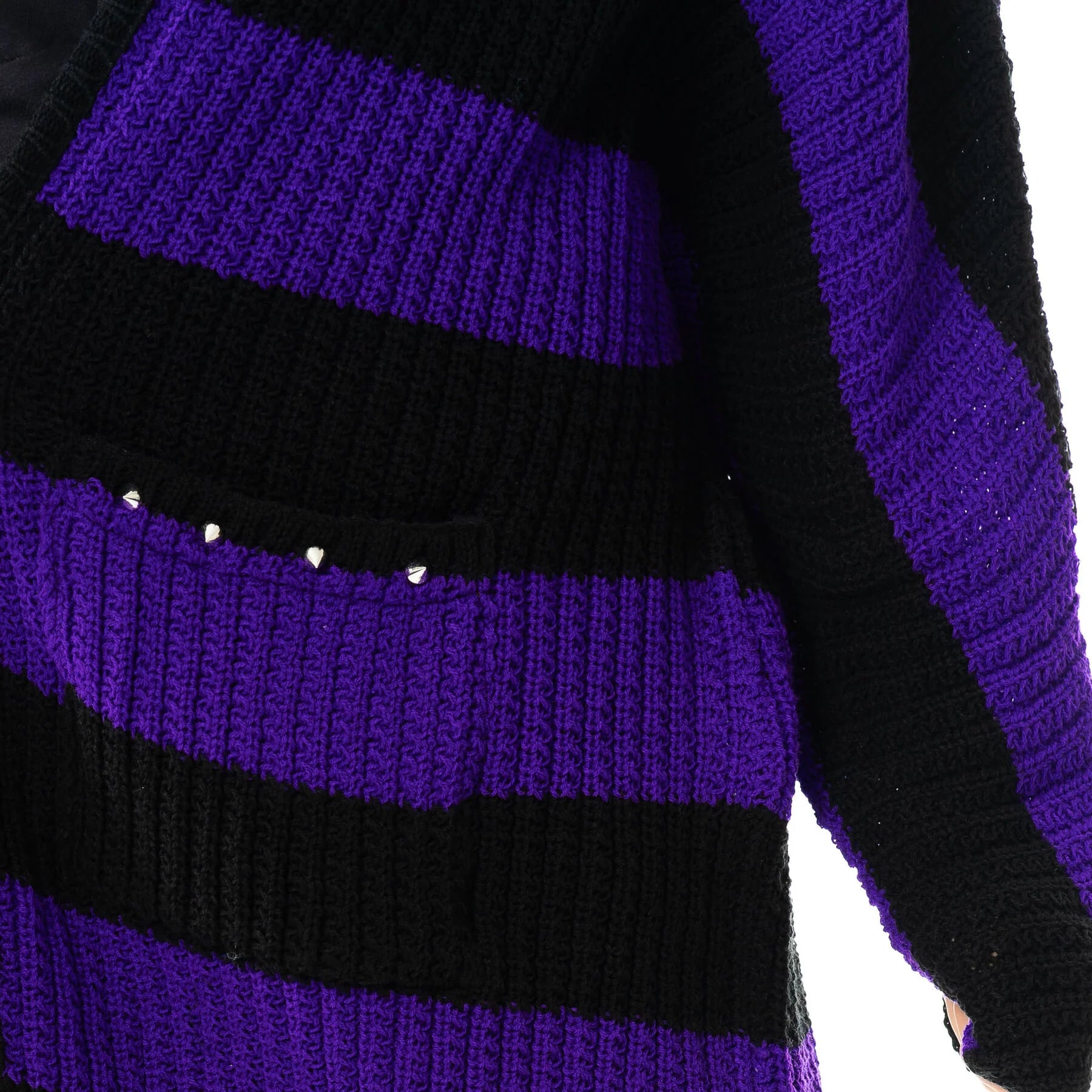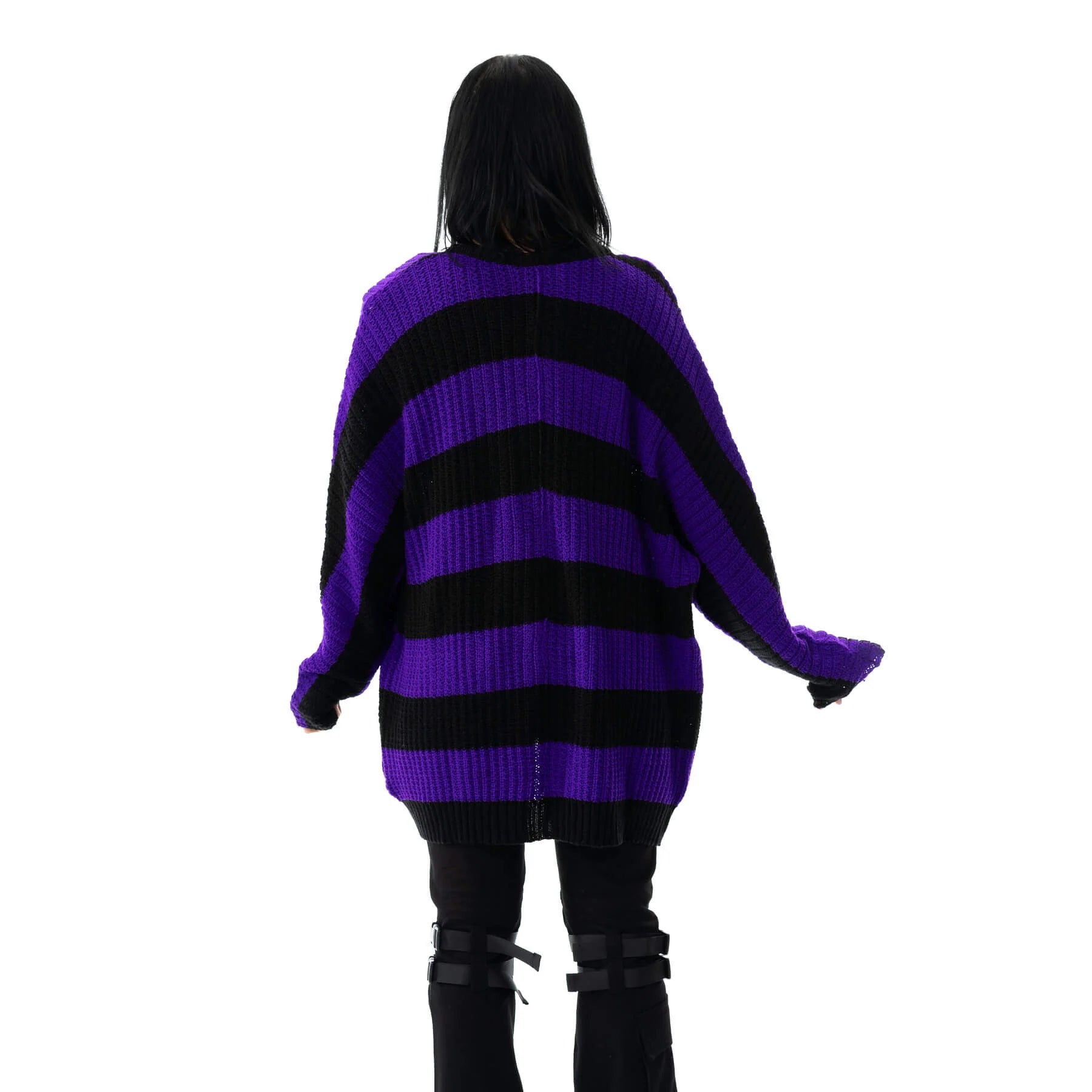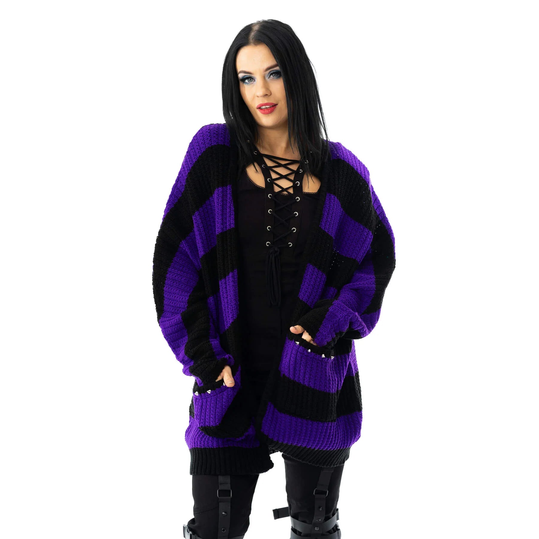 Elevate your style with the Heartless In A Daze Cardigan, featuring bold purple and black stripes that make a striking statement. The studded pocket detail adds an edgy touch, blending fashion with attitude. Perfect for layering, this cardigan offers both comfort and a standout look that turns heads wherever you go.