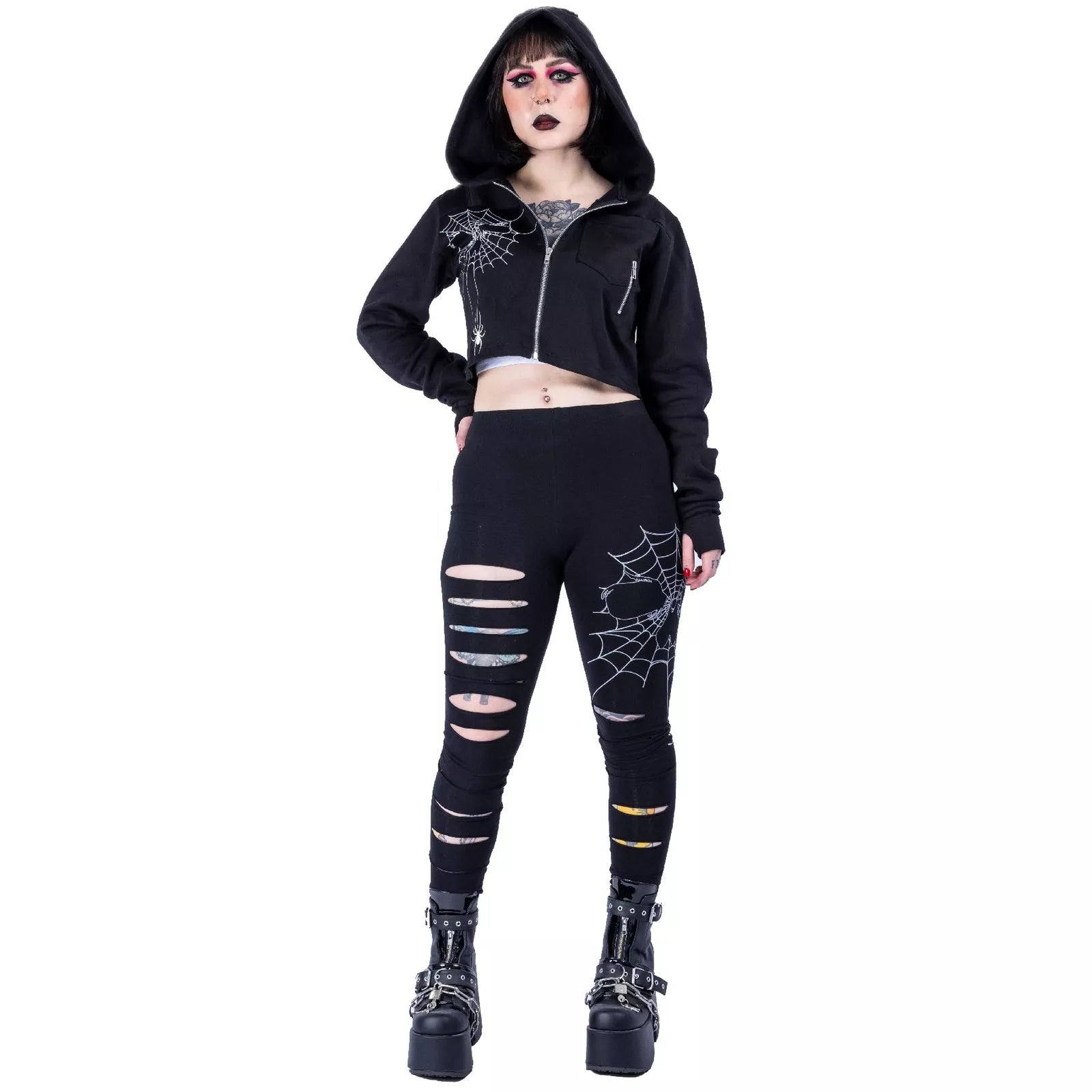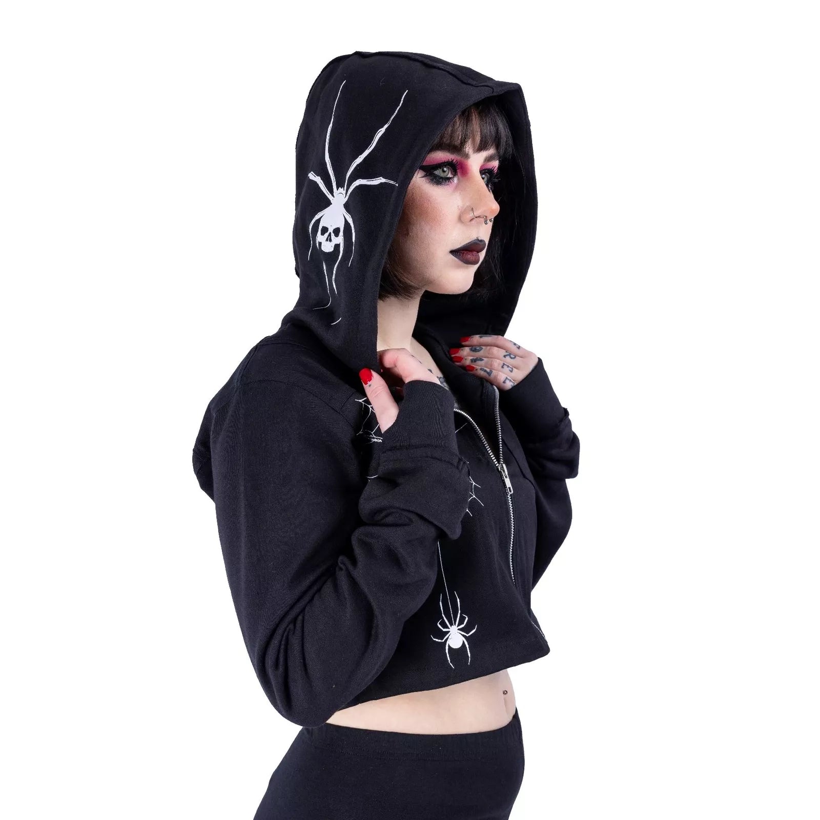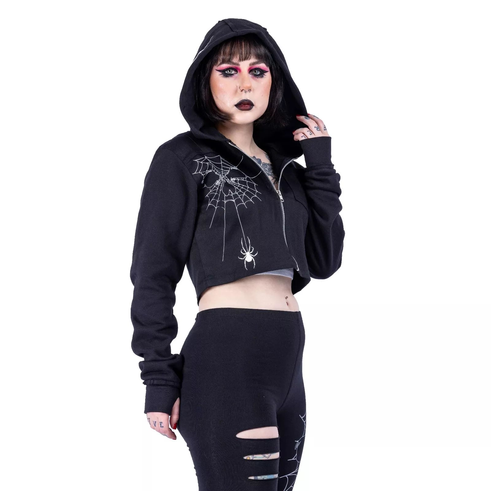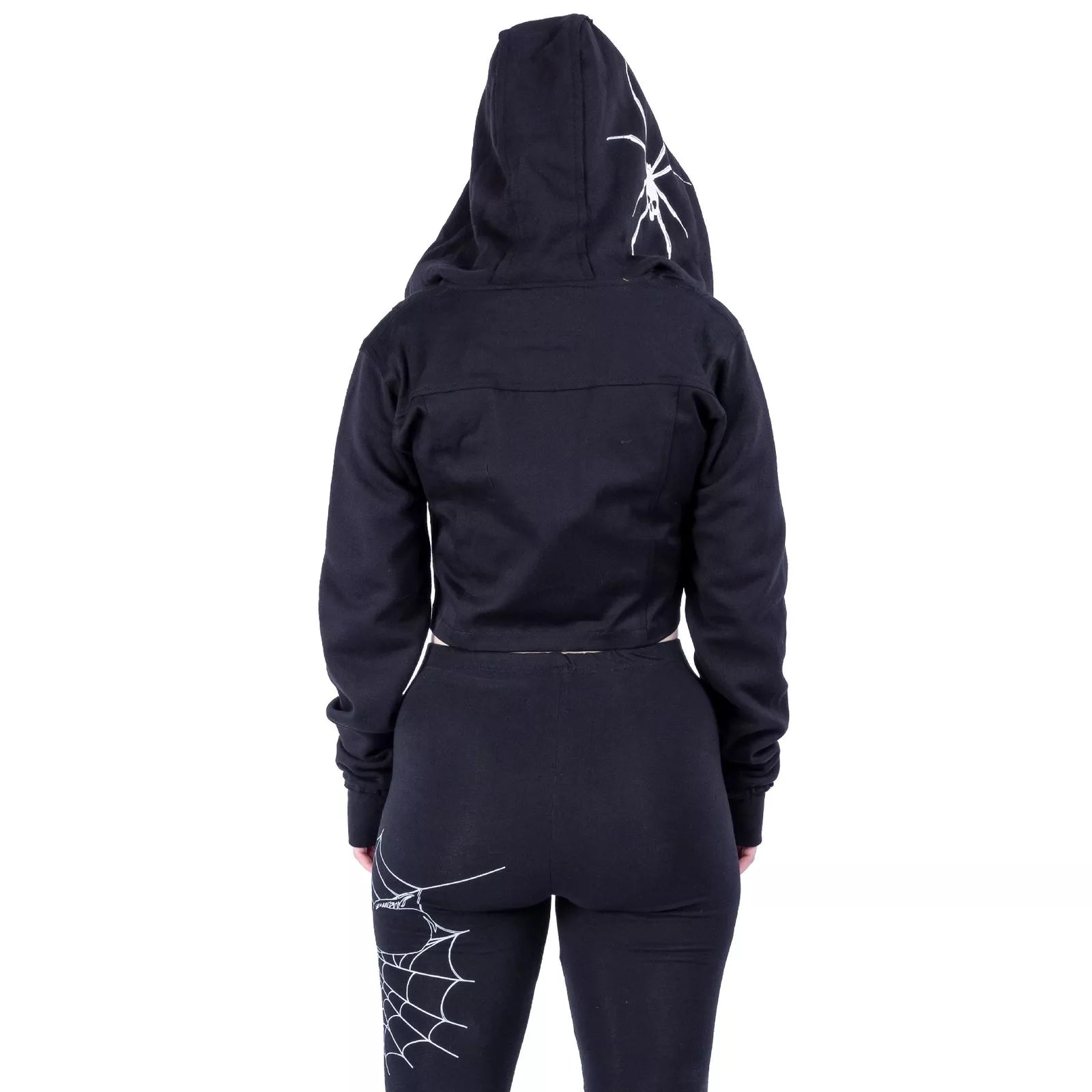 This stunning cropped silhouette features an bold spiderweb design across the front that captures attention and imagination. The distinctive spider print adorning the hood adds a touch of dangerous allure that sets you apart from the crowd. Don't just wear a jacket—make a statement that showcases your bold style.