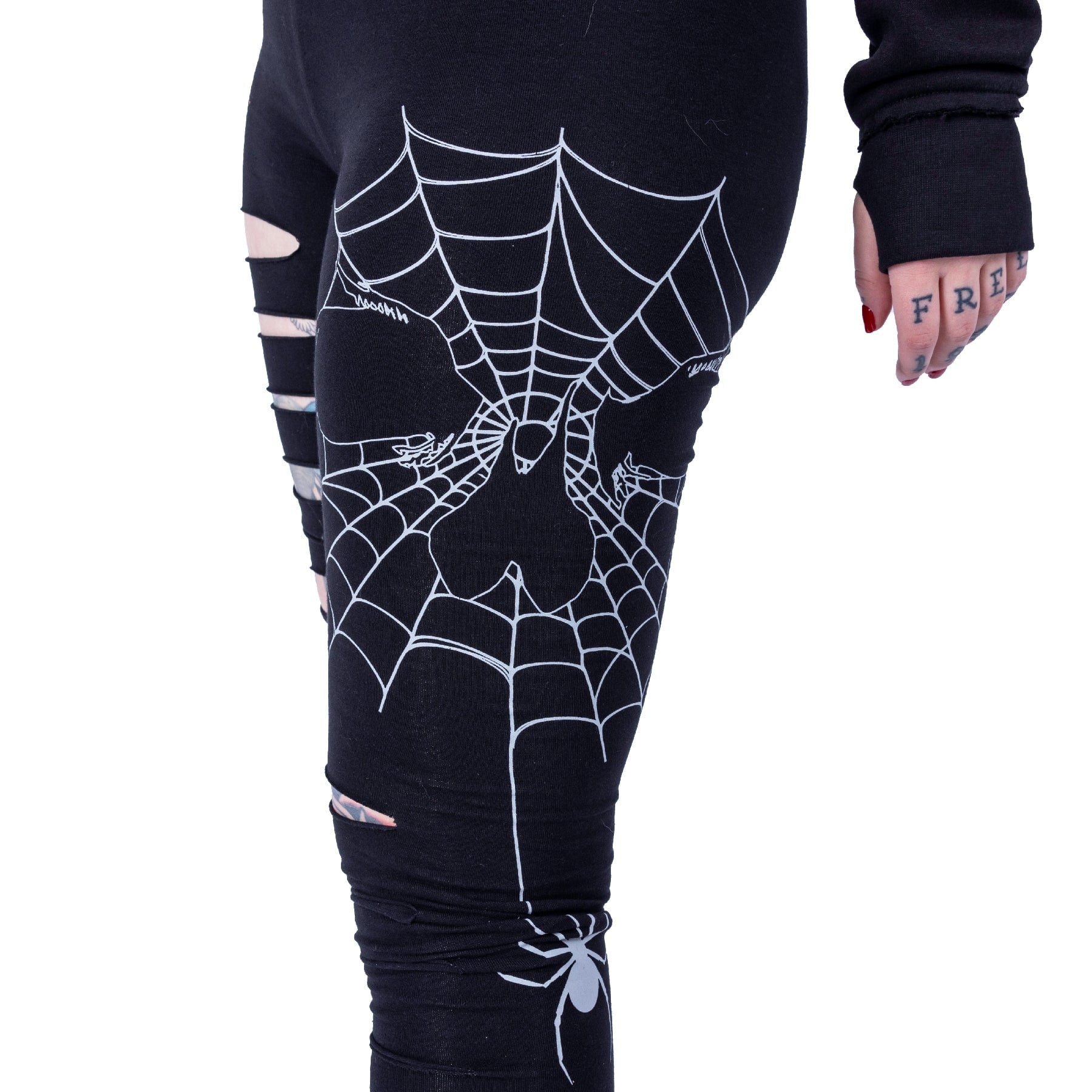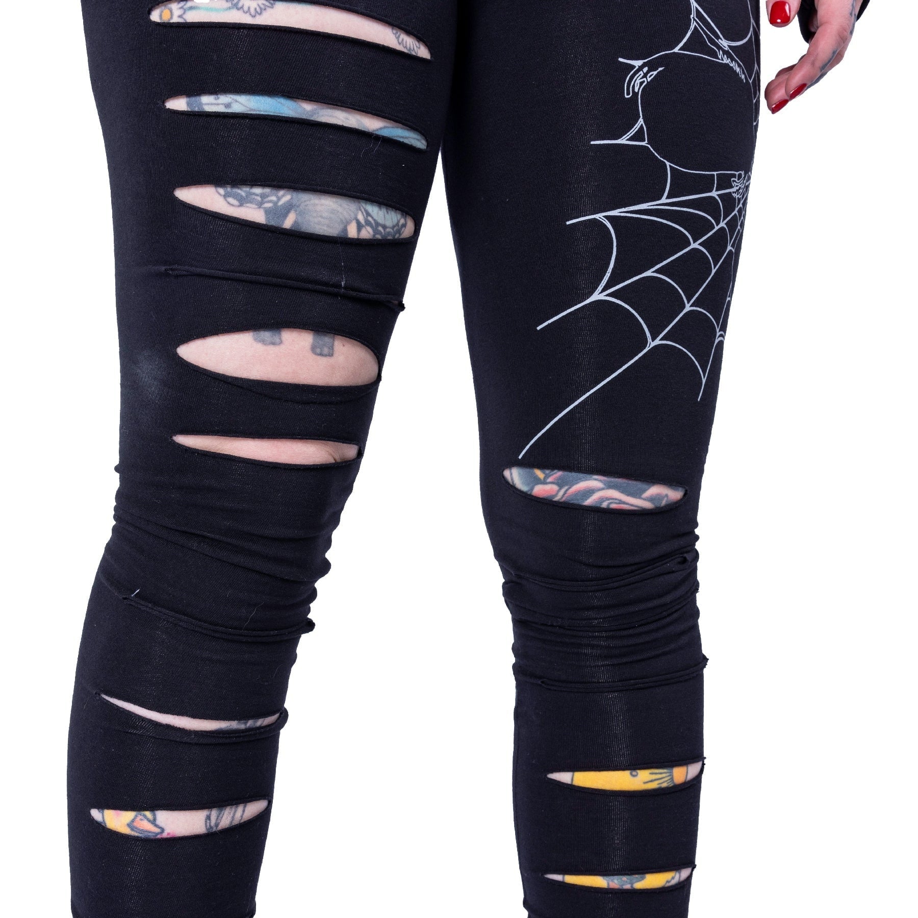 Elevate your edgy style with our Heartless Widow Maker Leggings. These striking black leggings feature an intricate cobweb design with a dangling spider detail and edgy slit cut-outs running down the legs. Crafted from a premium blend of 95% cotton and 5% elastane, they offer the perfect balance of comfort and stretch that hugs your curves while allowing unrestricted movement. Make a statement that's impossible to ignore.