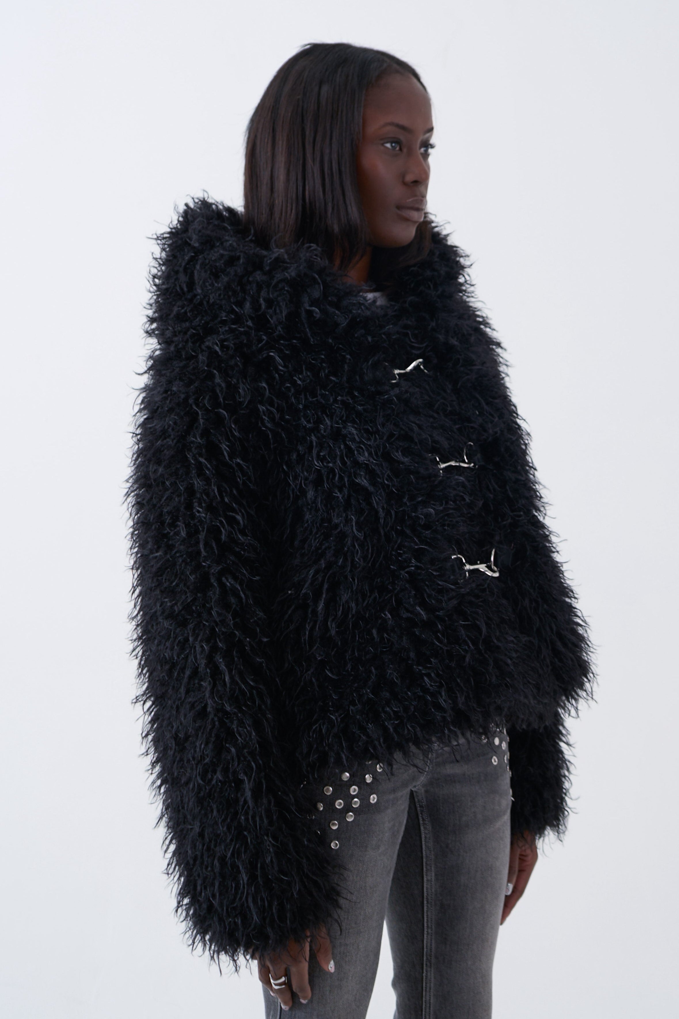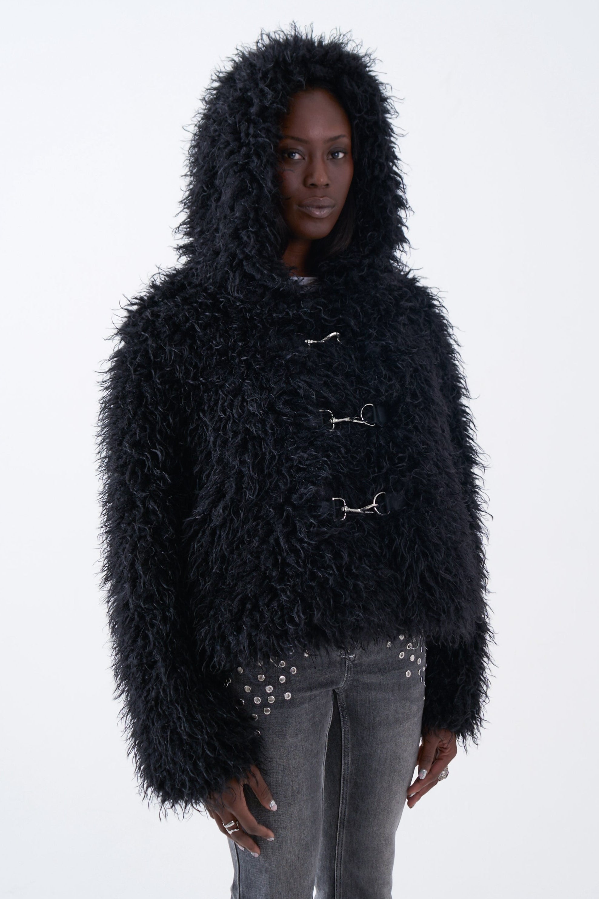 Black super shaggy textured faux fur coat with oversized hood and silver hardware fastening. Heavyweight super shaggy textured faux fur...
